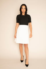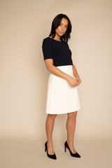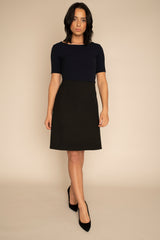 CATHERINE and VICTORIA.  A match made in heaven. A classic sleeved top with a beautifully tailored a-line skirt. Cut from a sustainably sourced stretch combined with our Careaux innovation to adapt to the different moments in your day.